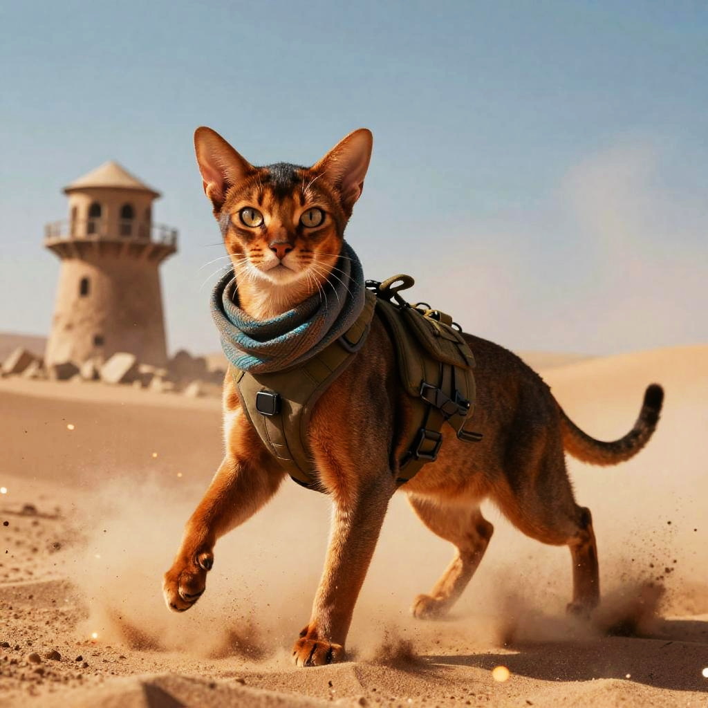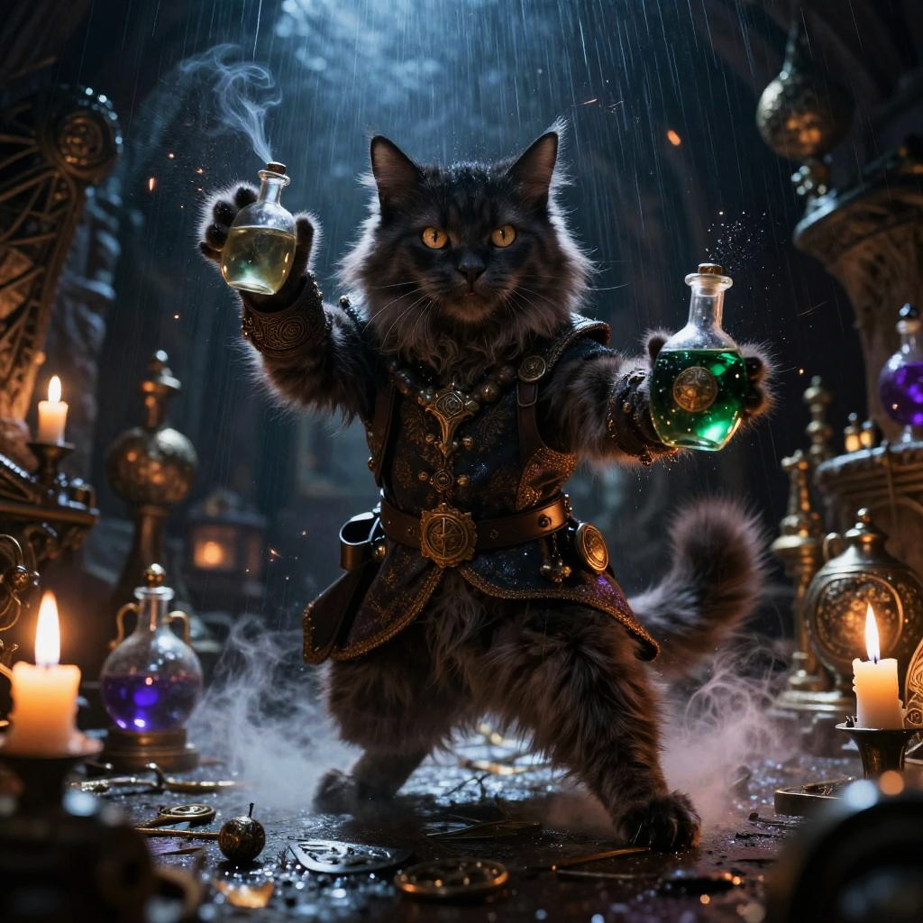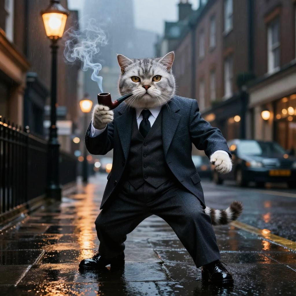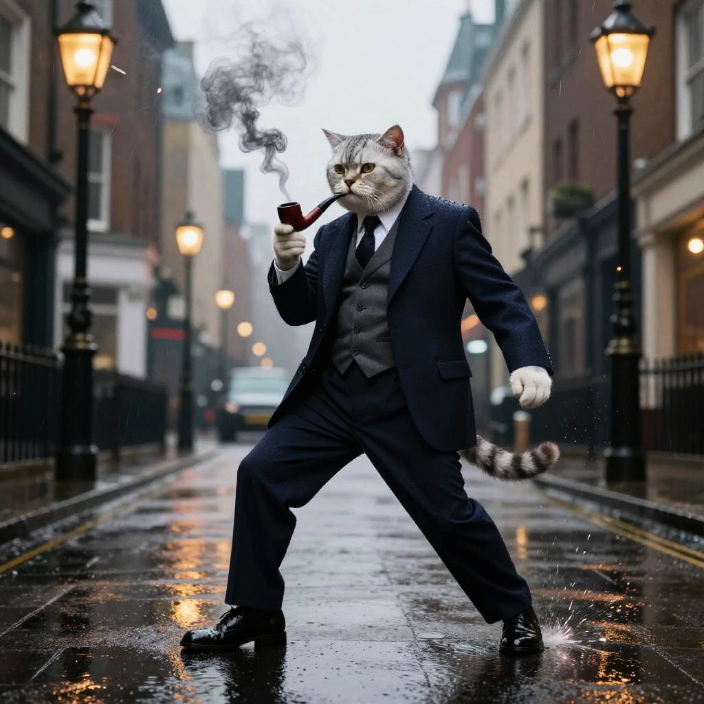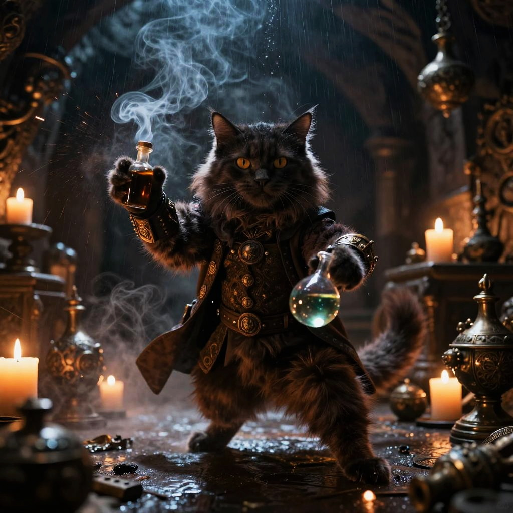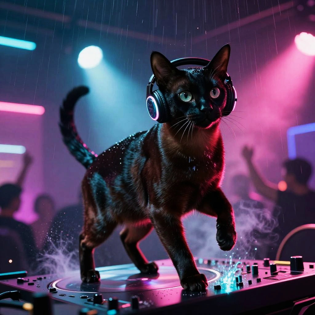 (full body) compact spotted Ocicat, fierce motorbike gang leader with leather jacket, in rain-soaked industrial district at night, black, orange, and blue predominate, hyper-detailing, hyper-realism, tack sharp, cinematic splash screen energy, action-packed composition, dynamic pose, rain and sparks, smoke plumes, glossy reflections, dramatic rim light, volumetric fog, motion blur trails, embers, HDR, film grain, photoreal lighting, rich textures, epic mood