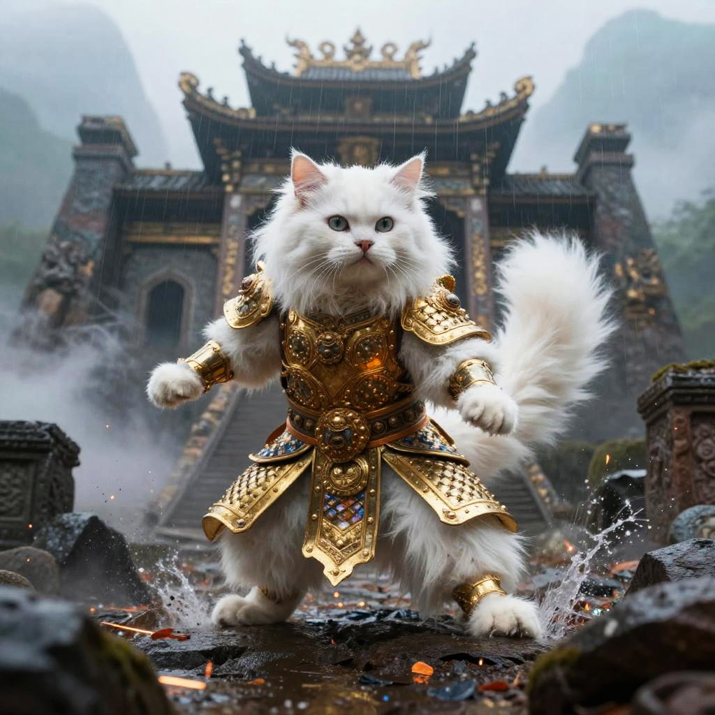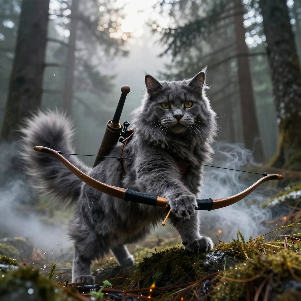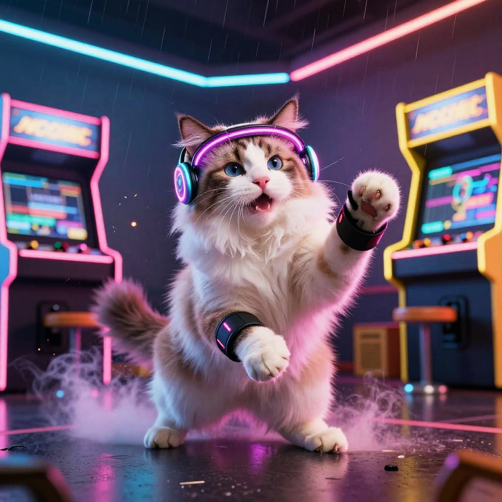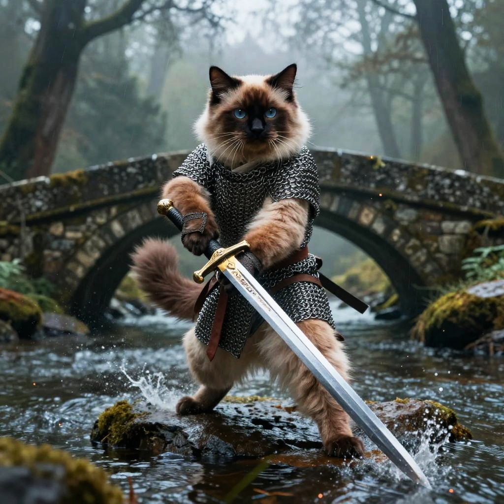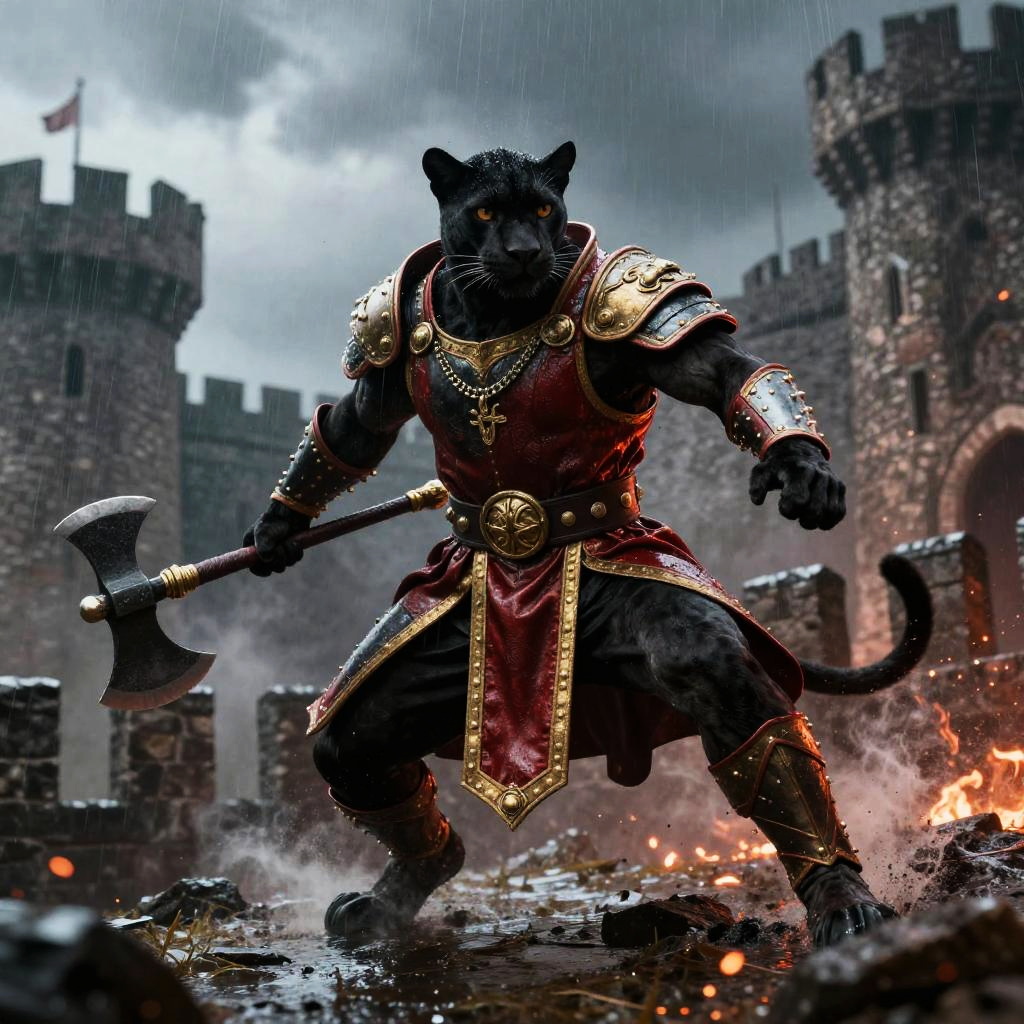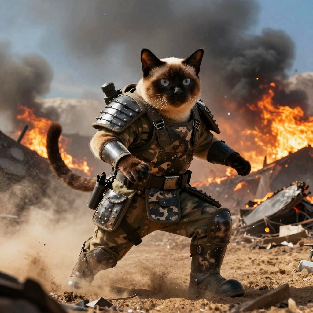 (full body) compact spotted Ocicat, fierce motorbike gang leader with leather jacket, in rain-soaked industrial district at night, black, orange, and blue predominate, hyper-detailing, hyper-realism, tack sharp, cinematic splash screen energy, action-packed composition, dynamic pose, rain and sparks, smoke plumes, glossy reflections, dramatic rim light, volumetric fog, motion blur trails, embers, HDR, film grain, photoreal lighting, rich textures, epic mood