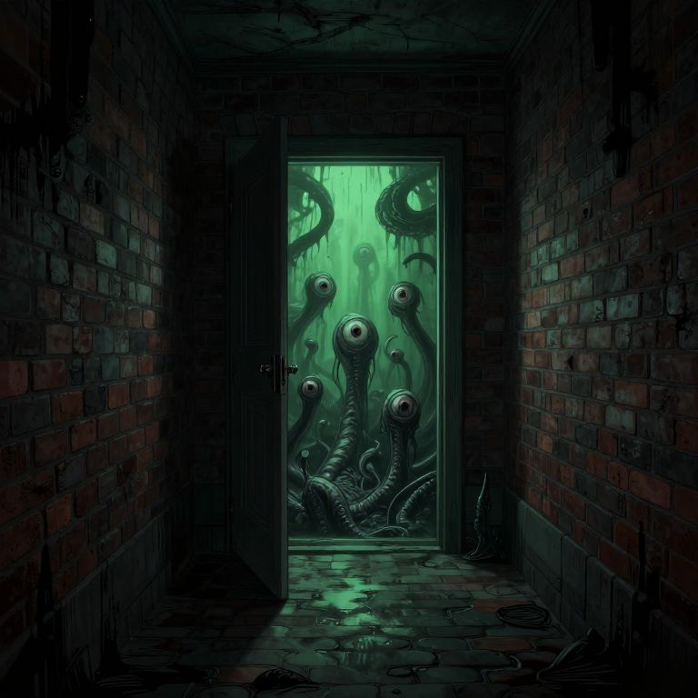 This digital artwork depicts a dark, narrow, brick-walled hallway with a slightly ajar door at the center. Behind the door, eerie green lighting illuminates a grotesque scene of several large, tentacled creatures with multiple eyes and elongated, twisting bodies. The creatures' textures are slick and slimy, adding to the horror aesthetic. The floor is wet and reflective, enhancing the eerie atmosphere. The brick walls are detailed with shadows and cracks, contributing to the overall sense of decay and fear. The green light from the door contrasts sharply with the dark, shadowy hallway, creating a haunting and unsettling visual effect.