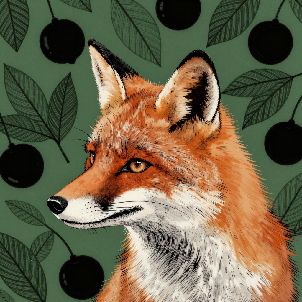 Digital illustration of a fox's head in profile facing left, featuring detailed black ink lines depicting the fluffy fur texture, pointed ears, and sharp amber eyes. The background is a dense pattern of dark green leaves and round black fruits, creating a naturalistic and artistic setting.