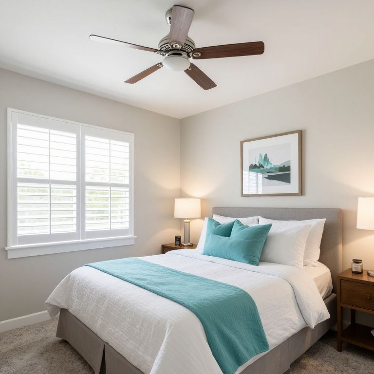 Cozy bedroom featuring a neatly made bed with white linens and turquoise accents, positioned beneath a ceiling fan, flanked by a nightstand with a lamp and framed artwork on the wall, all within a light-filled space with a window adorned by shutters.