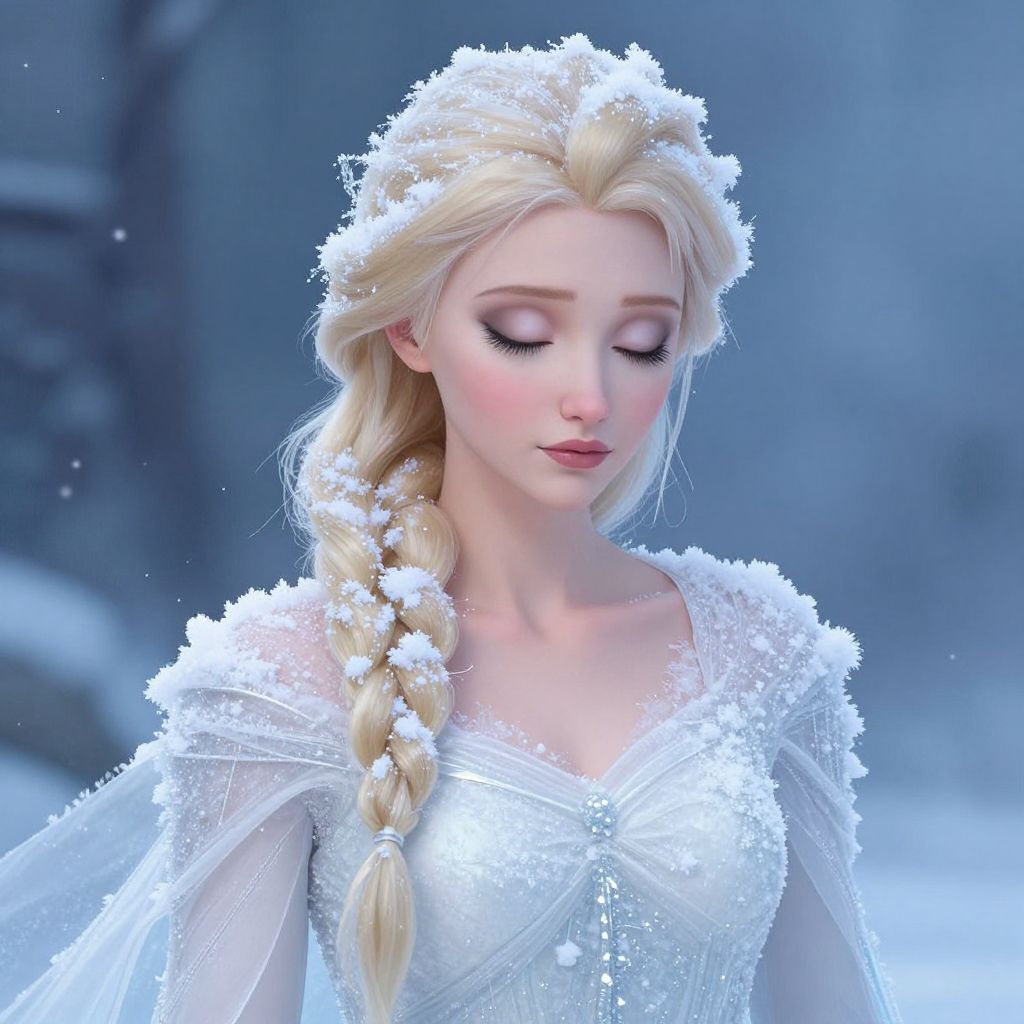 Digital art of Elsa from Frozen, with snow-covered blonde braid, closed eyes, white icy dress, and frosty blue background.