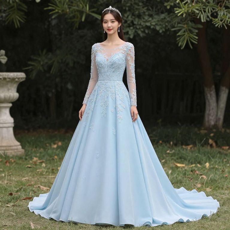 Photograph of an Asian woman with fair skin and dark hair in an elegant, light blue wedding gown. The dress features long, sheer lace sleeves, intricate floral embroidery on the bodice, and a full, flowing skirt with a subtle train. She wears a delicate tiara and stands in a lush garden with dark green foliage and a stone pedestal in the background. The dress contrasts with the green grass, highlighting its pastel color and delicate texture. The woman's expression is calm and composed.