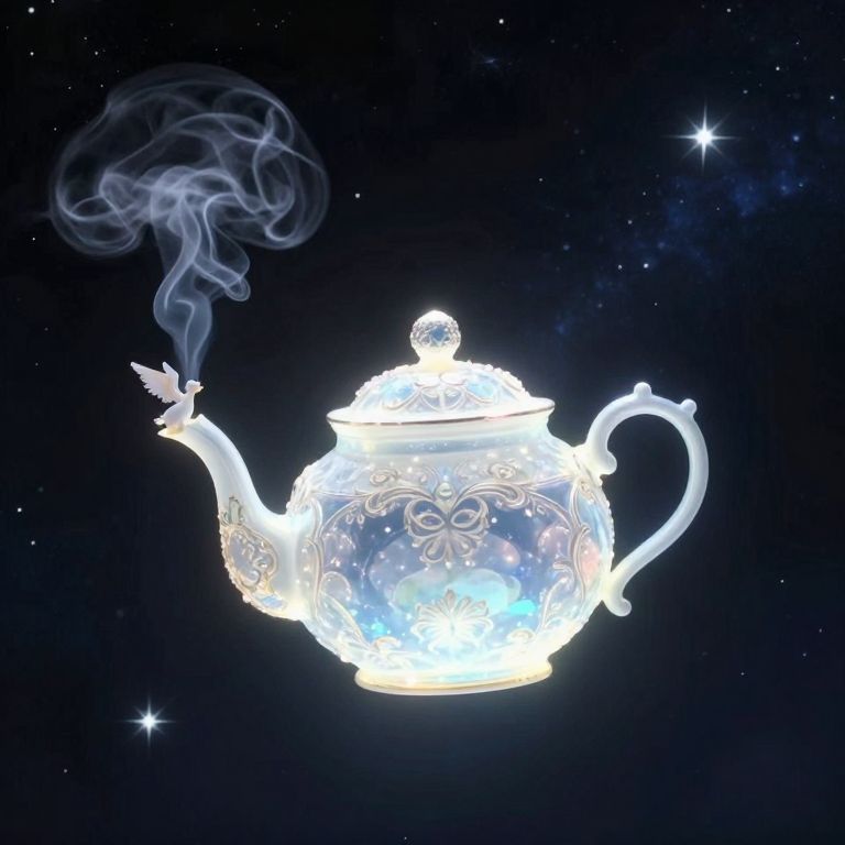 Digital artwork of a glowing, ornate silver teapot with intricate floral patterns, floating in a dark, starry space. The teapot emits wisps of white smoke from its spout, which features a small, illuminated bird perched on its edge. The teapot's lid is adorned with a sphere-like knob, and its handle curves elegantly. Bright stars and cosmic dust are scattered in the background, enhancing the celestial theme. The teapot's luminescence creates a radiant, ethereal effect, contrasting with the dark, infinite expanse of space.