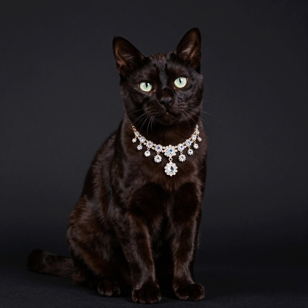 Luxurious studio portrait of a Munchkin cat sitting upright, glossy dark fur, wearing an ornate sparkling diamond necklace, clean dark background with spotlight, high-end fashion pet photography, high resolution, ultra-detailed