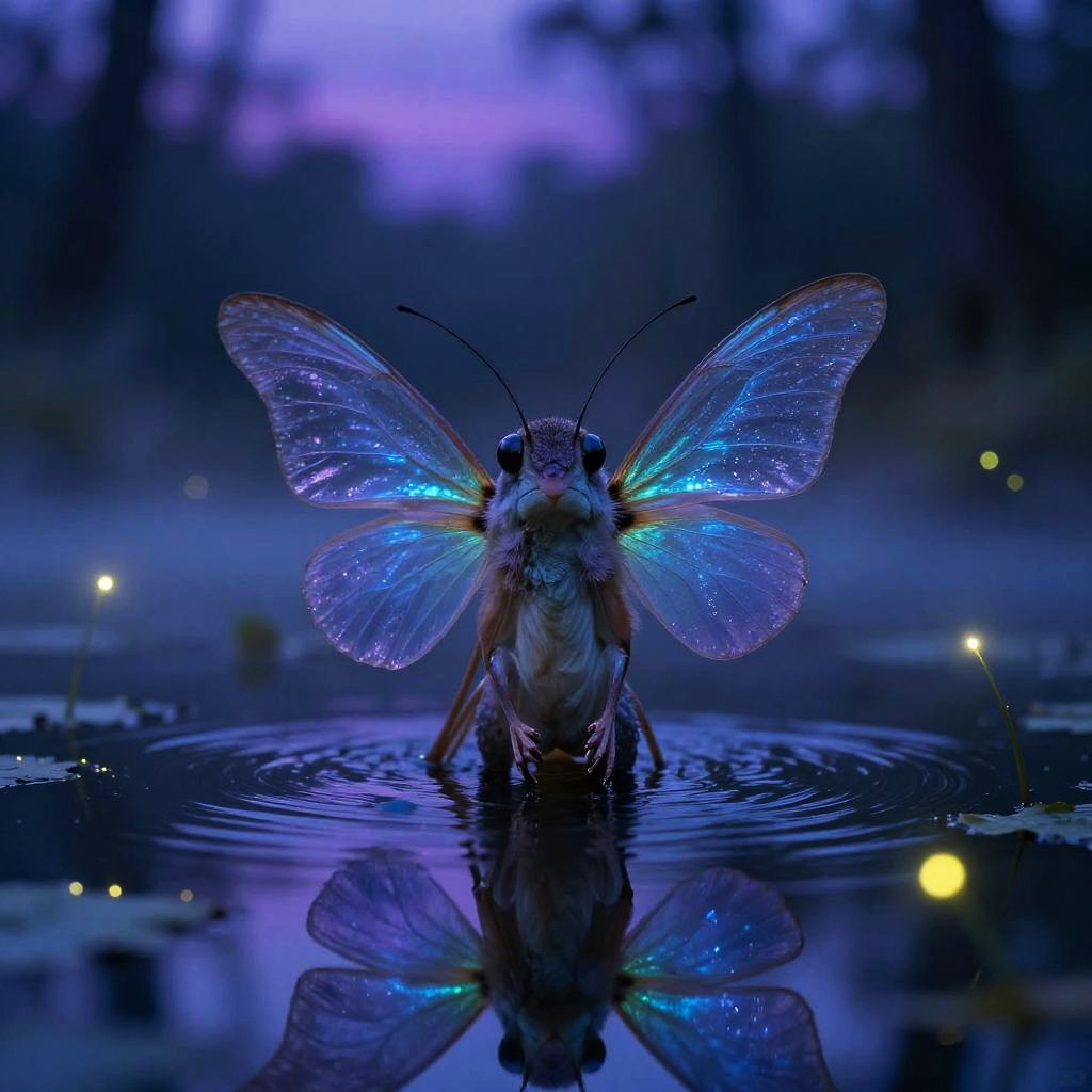 Mystical grenouille emerging from a shimmering blue pond at twilight, surrounded by glowing fireflies and mist, reflective water surface, ethereal atmosphere with rich purples and blues, fantasy wildlife portrait with rich detail