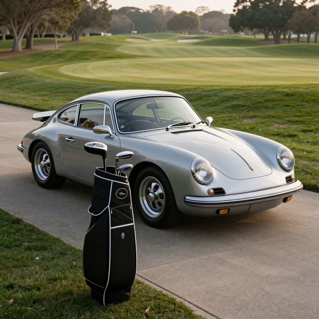 An elegant display of Porsche golf clubs beside a classic Porsche sports car on a golf course driveway, blending precision engineering of car and clubs, lush green fairway in the background, early morning light creating reflections on metal surfaces.