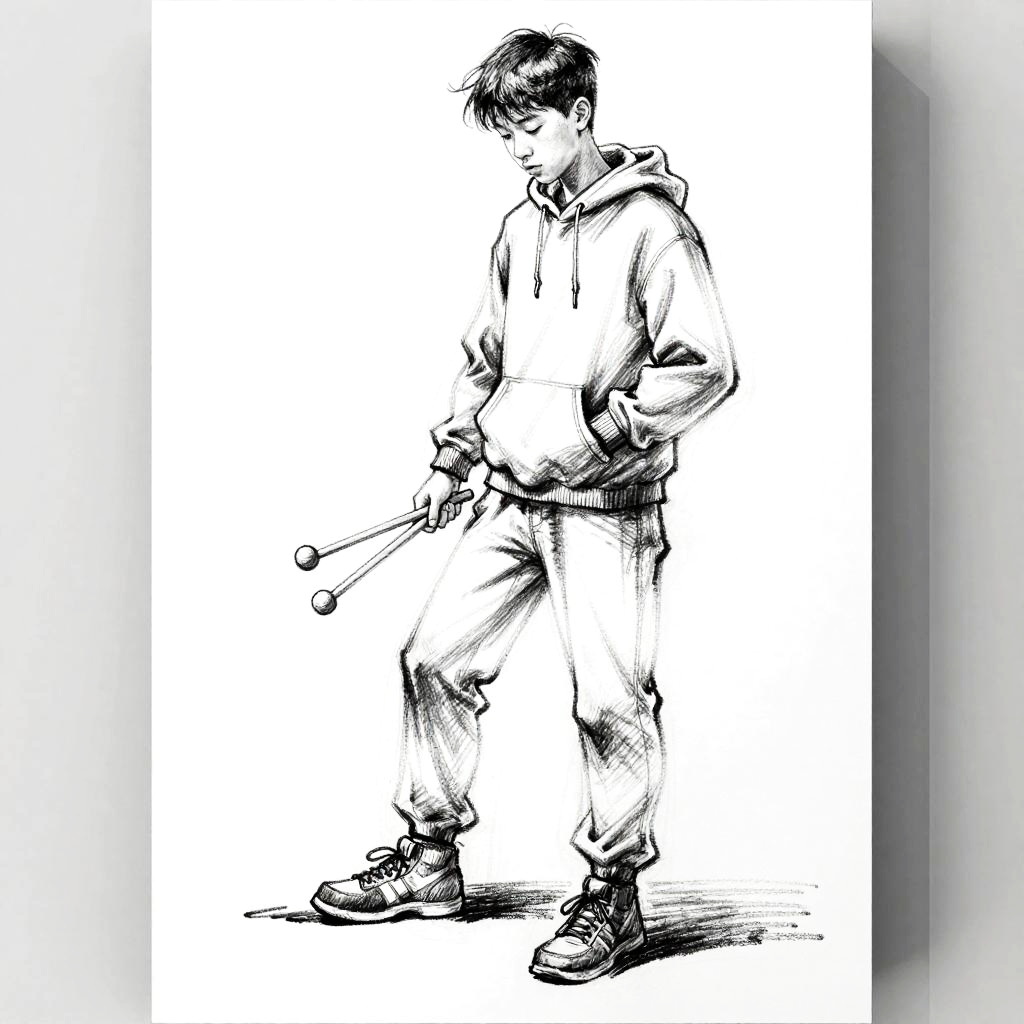 This is a rough chalk sketch study of a teenage boy with a hoodie and sneakers holding drum sticks. One leg slightly forward, head tilted down, eyes on the strings. Quick gestural lines, confident hatching, smudged shading, casual and spontaneous. High contrast black and white on mostly white background with soft gray side borders and subtle paper texture. Clean composition, minimal props, slight figure tilt. Studio light from above, gentle falloff, elegant and restrained mood.
