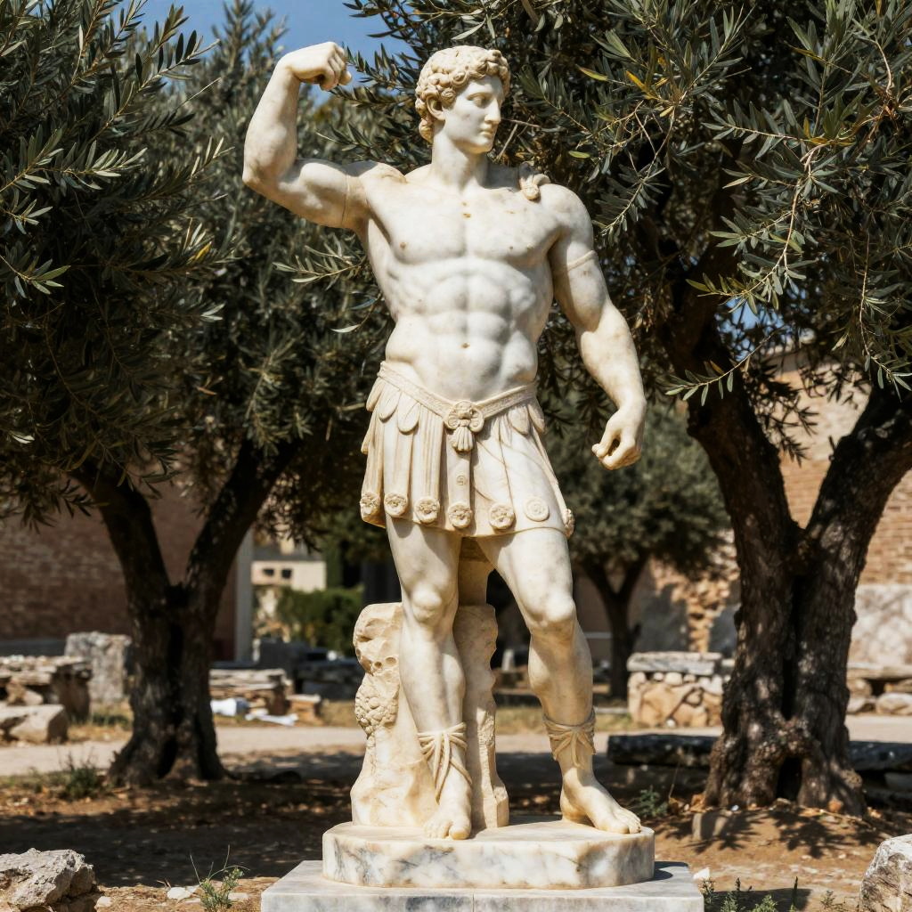 Jacked Greek statue of a muscular ancient warrior, chiseled abs and powerful arms, standing tall on a marble pedestal, surrounded by olive trees and ruins, dramatic sunlight highlighting the intricate marble texture, epic classical sculpture style.
