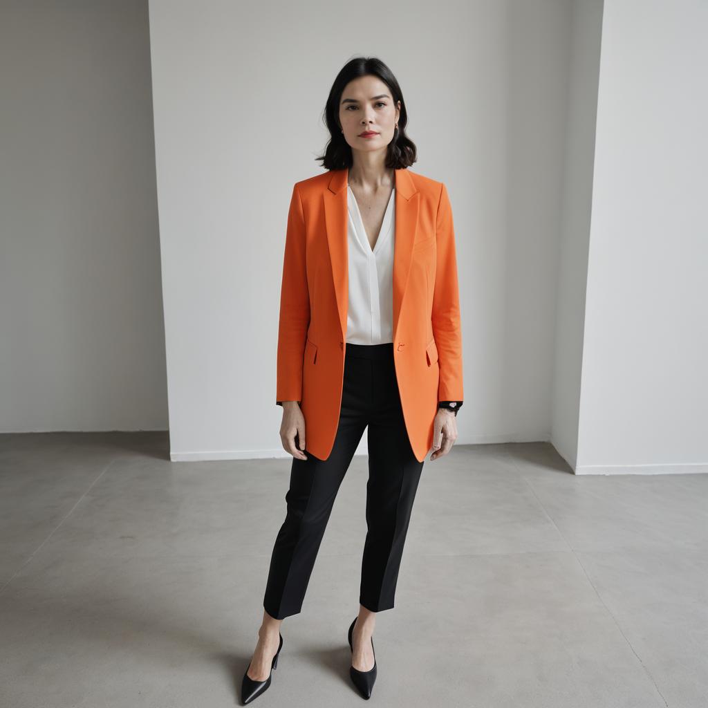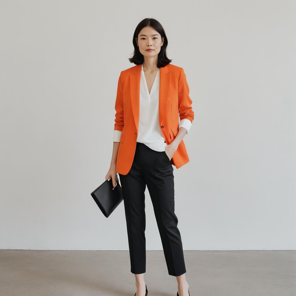 Portrait of an Asian woman with choppy lob hairstyle wearing a bright orange tailored blazer over a white cotton blouse, paired with black slim-fit silk trousers and leather kitten heels. She holds a black clutch and stands against a minimalist, neutral-toned background, embodying modern and understated elegance with sleek lines and a monochrome palette.