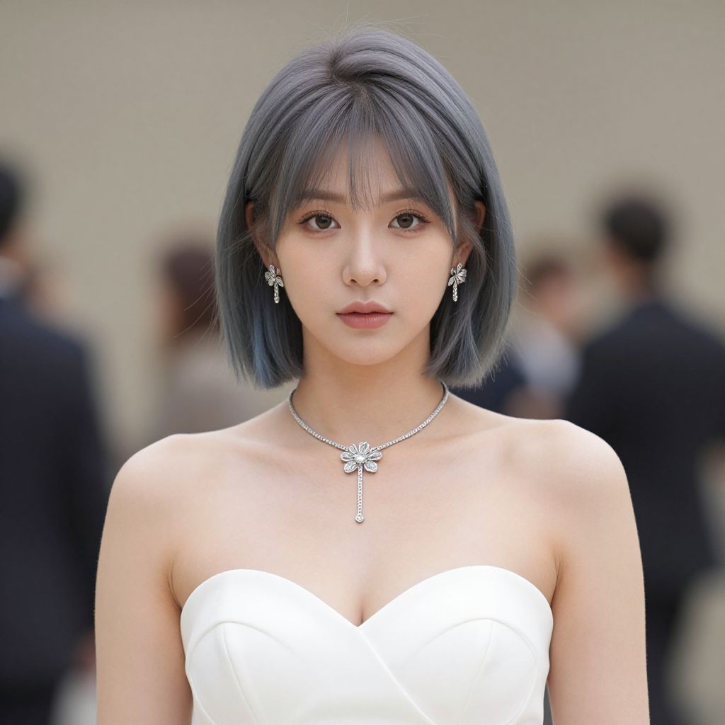 Photograph of an Asian woman with short, sleek black hair, wearing a strapless white dress, silver necklace, and earrings, standing in a blurred