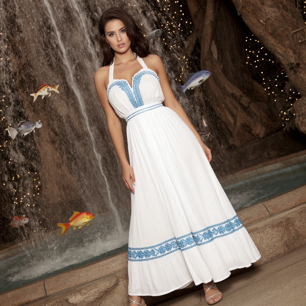 A Petite woman, bohemian style, white sleeveless maxi dress with blue embroidered details, halter neckline, gathered waist, flowing silhouette, silver strappy flat sandals, Wonderland waterfall with colorful fish. Dutch angle shot, sepia, christmas lights Sexy. Pretty face and beаutiful eyes. Big breasts