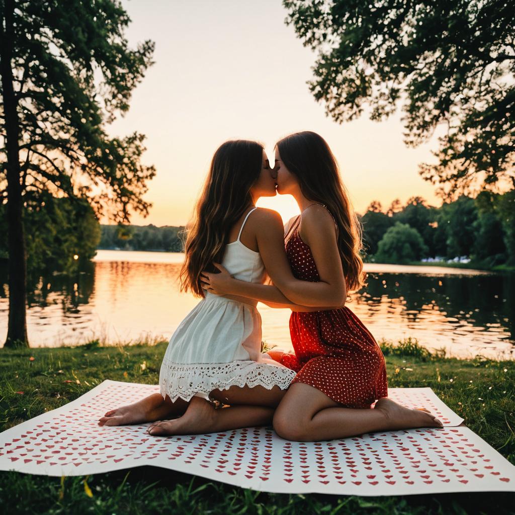 Two young women in love wearing summer dresses, one in white and one in red with white polka dots, embrace and kiss while kneeling on a picnic blanket by a lake during sunset. The natural setting features green trees and calm water with vivid warm colors of the golden hour.