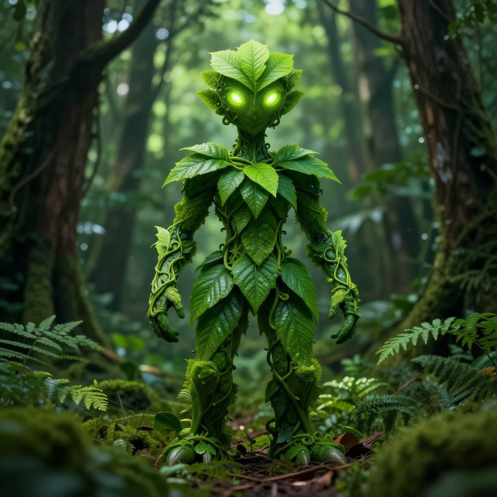 Anthropomorphic plant standing in a lush forest, vibrant green leaves forming a humanoid shape, glowing eyes, intricate vine details, fantasy style, high resolution