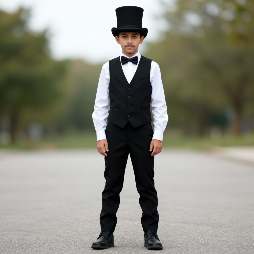 "man magician costume, 1boy, solo, male focus, hat, top hat, pants, bow, black footwear, outdoors, bowtie, vest, white shirt, looking at viewer, black bow, shirt, facial hair, boots, full body, black pants, standing, realistic, long sleeves, black bowtie, black headwear, mustache, black vest Realistic photo of casual sexy person with pretty face"