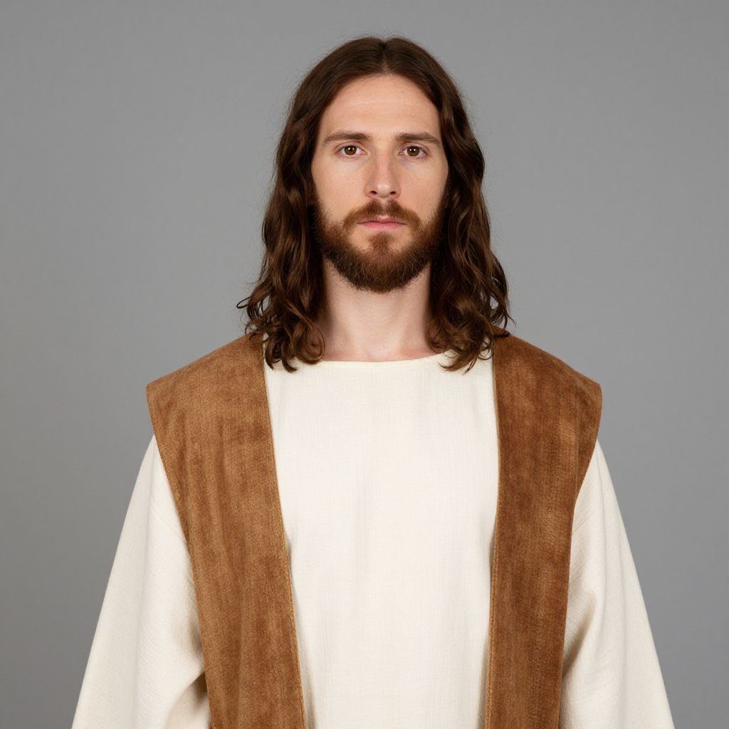 Photograph of a white man with long, wavy dark brown hair and a full beard, wearing a white tunic with a brown, textured, sleeveless vest. He has a neutral expression and is centered against a plain, light gray background. His skin is fair, and he has dark brown eyes. The image has a realistic style, emphasizing the natural texture of his hair and beard, as well as the fabric of his clothing. The lighting is even, eliminating shadows and highlighting the simplicity of the scene.