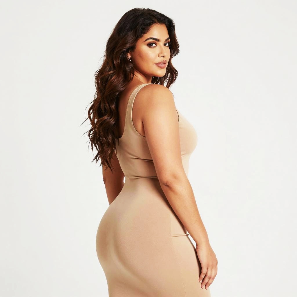 Photograph of a curvy woman with long, wavy dark brown hair. She's standing in a three-quarter profile, looking over her shoulder with a confident expression. She's wearing a tight, sleeveless, beige dress that highlights her hourglass figure. The background is completely white, making her the focal point. The lighting is bright, emphasizing her smooth, glowing skin.