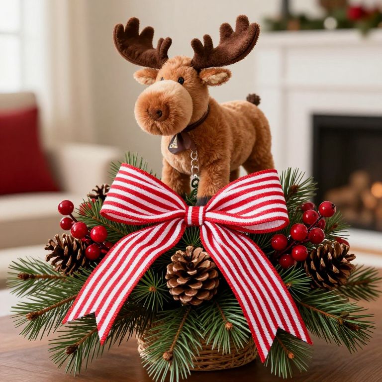 Fun Christmas centerpiece with pine cones, red berries and a red and white striped bow topped with a plush moose