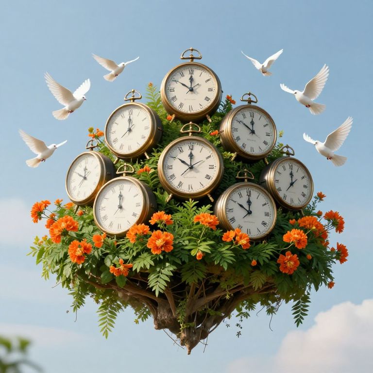 This photograph features a whimsical, floating clock garden against a clear blue sky. The centerpiece is a cluster of nine vintage-style, round clocks with white faces and black numbers, each attached to a green, leafy branch. Bright orange marigold flowers intersperse the foliage, adding vibrant color. Six white doves are mid-flight around the clock garden, their wings spread gracefully. The clocks are evenly spaced, creating a balanced, spherical arrangement. The image exudes a sense of timelessness and nature's harmony, with the clocks and flowers contrasting against the bright, cloudless sky.