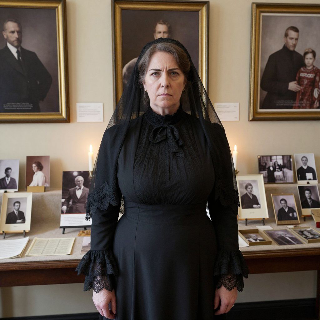 Photograph of a middle-aged woman with fair skin, dark brown hair, and a solemn expression, wearing a black, long-sleeved Victorian-style dress with lace trim and a black veil. She stands in front of a wall adorned with three framed portraits of men in formal attire, and a display table with numerous black-and-white photographs of men in suits, some holding medals. The background is well-lit, with soft, warm lighting illuminating the portraits and photographs. The setting appears to be a museum or historical exhibit room, emphasizing a somber, respectful atmosphere.