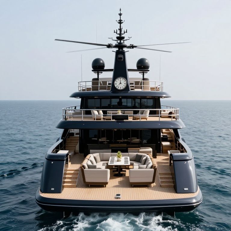 Luxurious yacht cruising gracefully through calm seas, featuring multiple decks with expansive terraces, a central dining area surrounded by plush seating, and a striking black superstructure topped with two helicopter pads and a prominent clock.