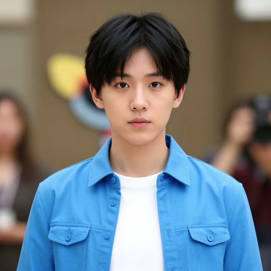 Photograph of a young Asian man with straight black hair and fair skin, wearing a bright blue button-up shirt over a white t-shirt. He has a neutral expression and is centered in the frame. The blurred background includes indistinct figures of people, one with a yellow object in hand, suggesting an outdoor or public setting. The image has a soft focus effect, emphasizing the subject's face and attire.