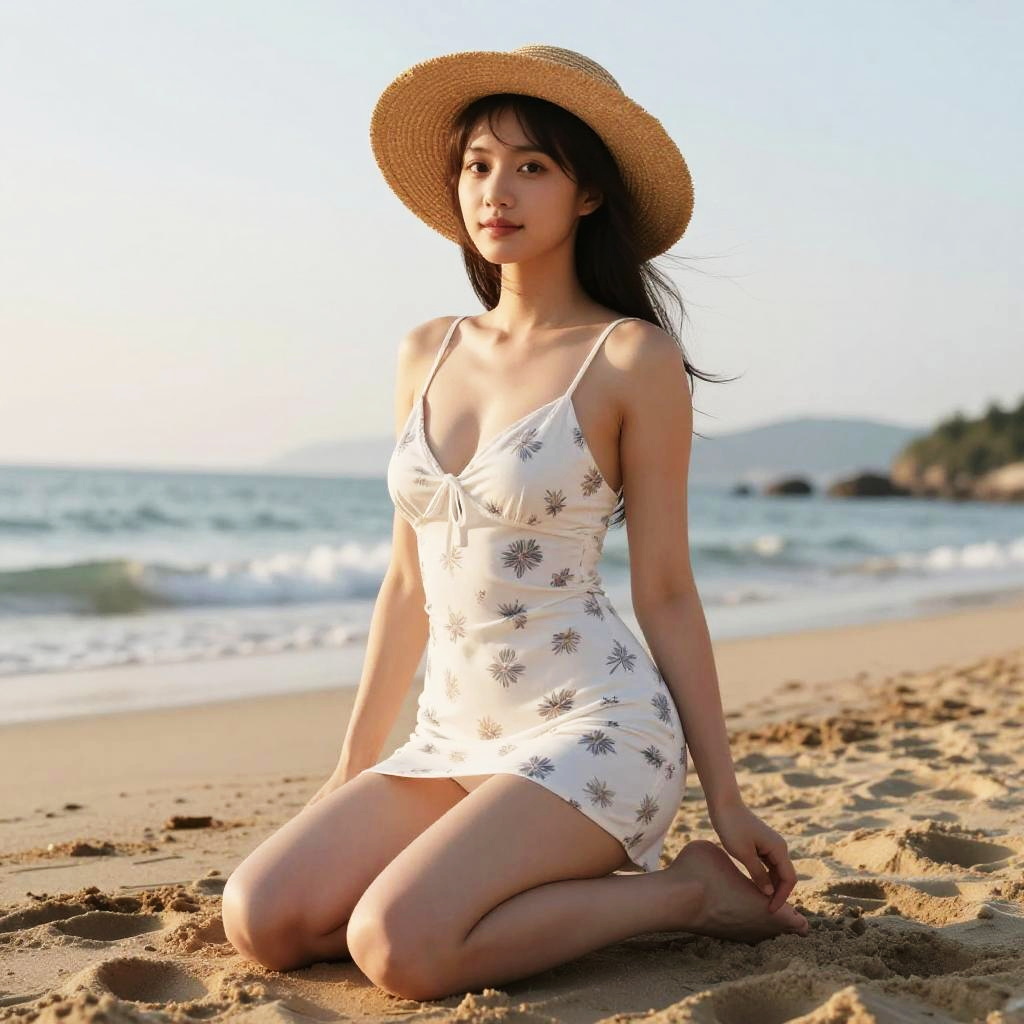 Photorealistic image of an Asian young woman standing at a beach during sunset. She is wearing a white open shirt and a dark pleated skirt, resembling a school uniform. Her long dark hair is tousled by the wind, partially covering her face and eyes. The warm sunlight and ocean waves in the background create a soft, vintage-style atmosphere with visible lens flare and film grain effects.