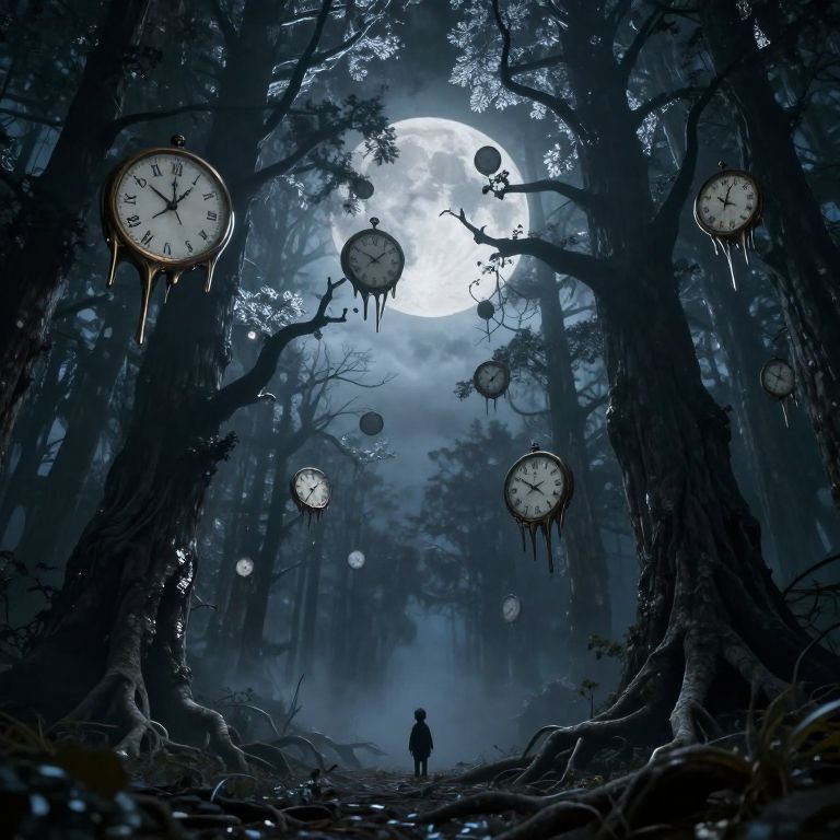 Digital artwork: Mysterious forest under a full moon, with floating, dripping clock faces, a lone figure silhouetted in the center.