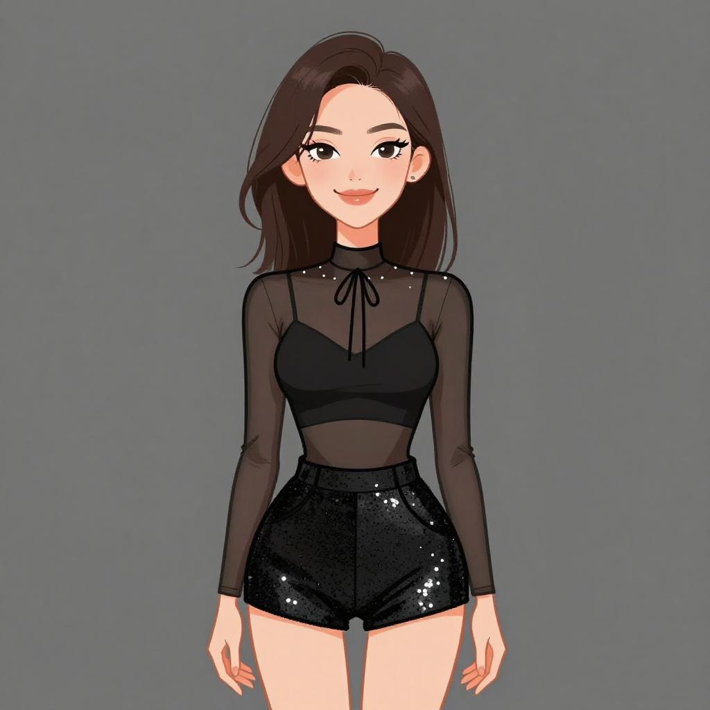 Woman with pretty face and pretty hair. smiling Woman, edgy, black mesh long-sleeve top with solid bodice, drawstring detail at the neck, stud embellishments along the neckline and shoulders, paired with black sequined shorts, high-waist with tight fit. --sref 1467
