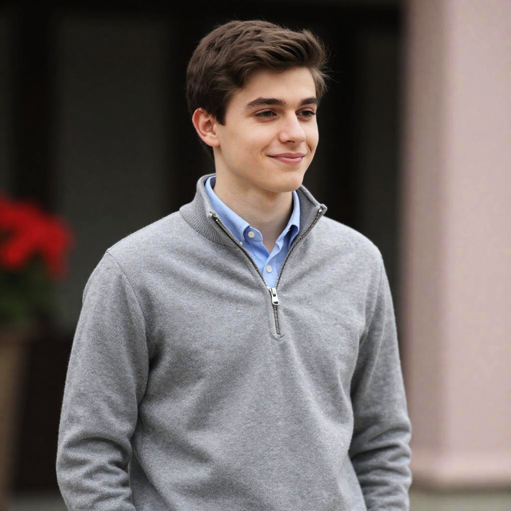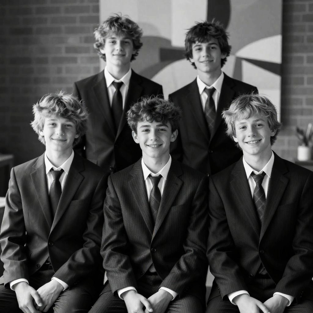 Photograph of three teenage boys standing in front of a house. Left boy with black bob haircut, white shirt with colorful pattern. Middle boy with medium brown hair, red sweater with blue patterns. Right boy with light brown hair, white sweater with red collar. All smiling, looking slightly to the right. Background: beige house exterior with overhang.