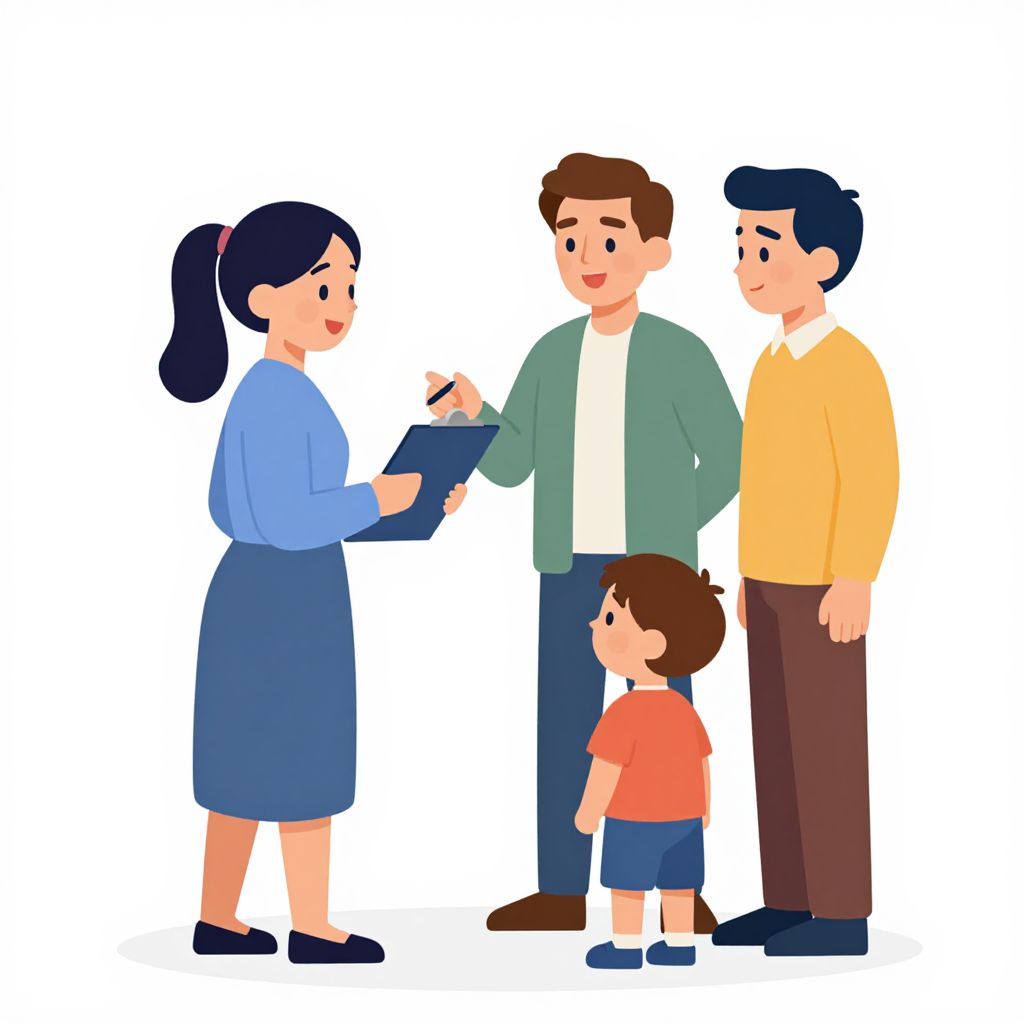 A vibrant cartoon-style illustration depicts a cheerful interaction between a man holding a clipboard and a family consisting of a woman, a man, and a little boy, all rendered in bright, flat colors with clean lines and a friendly, approachable aesthetic.
