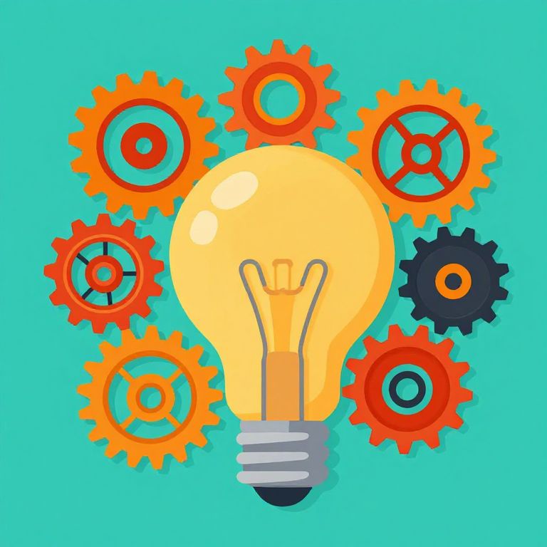 The image is a vibrant, flat-style vector illustration that creatively represents digital innovation through a lightbulb and cogwheels. The lightbulb, depicted in a warm, golden hue, is the central focus, symbolizing an idea or innovation. Surrounding the lightbulb are numerous cogwheels in various sizes and colors, including shades of orange, red, and black, which symbolize the mechanical and technological aspects of innovation. The cogwheels are intricately designed, with some featuring gears and other mechanical components, emphasizing the complexity and interconnectedness of digital innovation. The background is a solid teal color, providing a stark contrast that highlights the colorful elements of the illustration. The overall composition is dynamic, with the lightbulb and cogwheels arranged in a way that suggests movement and interaction, reflecting the fluid and evolving nature of digital innovation.