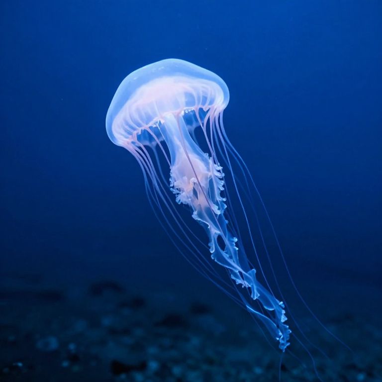 Glowing translucent jellyfish gracefully drifts through the deep blue ocean, its bioluminescent bell casting ethereal light upon its delicate, flowing tentacles that ripple gently against the dark, rocky seabed below.