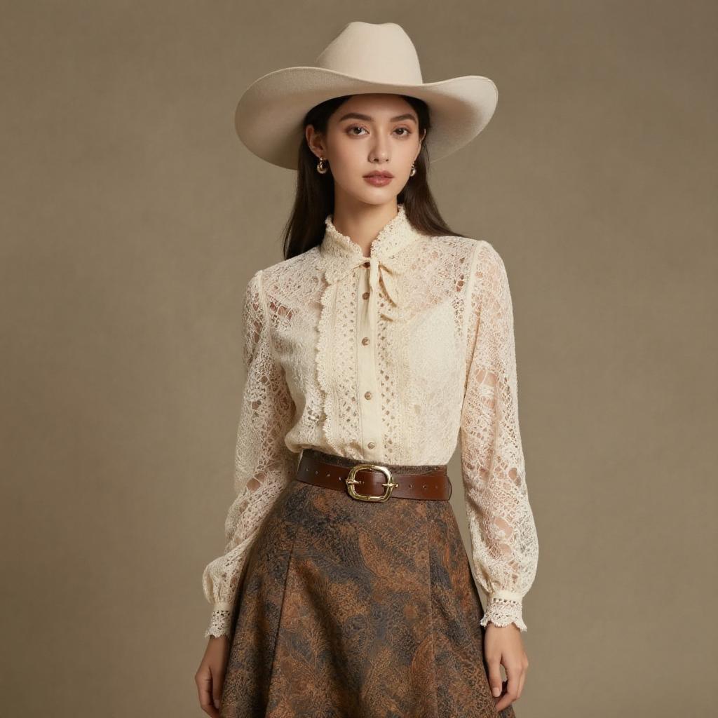 A poised woman adorned in a classic Western style, featuring a wide-brimmed hat, a lace-detailed blouse, and a vintage-inspired skirt, poses against a warm, textured backdrop, exuding a timeless elegance.