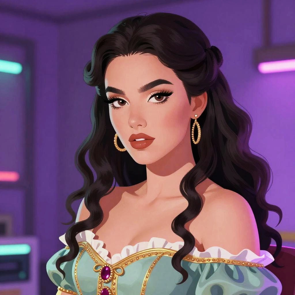 Woman illustration. Cartoon, erotic vibe. Fusion of styles Rococo style and Synthwave style