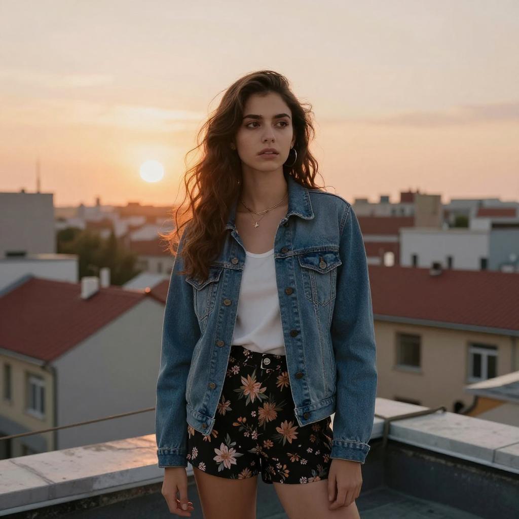 Photograph of a young woman with long, wavy brown hair, wearing a denim jacket and floral shorts, standing on a rooftop at sunset, with