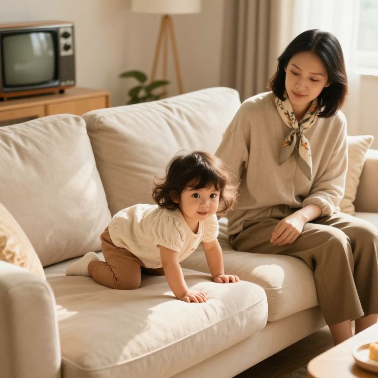 Photograph of an Asian mother and toddler in a bright, sunlit living room. The mother, with shoulder-length black hair and wearing a beige blouse and matching pants, sits on a cream-colored sofa, smiling gently. The toddler, with curly black hair, is on all fours on the sofa, wearing a white short-sleeved shirt and brown pants. In the background, a small wooden TV stand with a vintage black and silver TV and a potted plant are visible. The sofa is positioned near a window with beige curtains. The room has a cozy, warm atmosphere with soft, natural lighting.