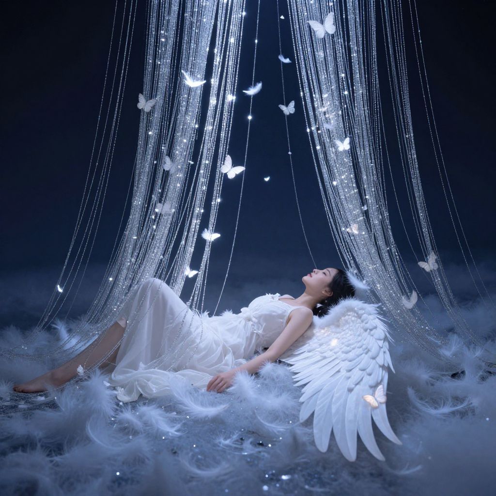 Glowing silver nets cascade down from above, gently collecting ethereal emotions as a serene woman with angelic wings rests peacefully beneath them, surrounded by soft white feathers and floating butterflies in a dreamlike night sky.