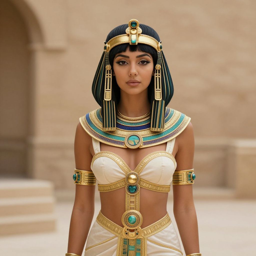 Digital artwork of an Egyptian woman with dark skin, black hair, wearing a gold and turquoise Nemes headpiece, white bra top, and skirt,