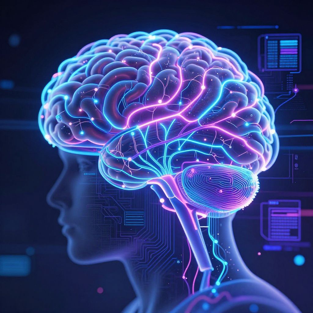 Digital illustration of a glowing, neon-blue and purple human head with detailed brain wiring, set against a dark, tech-themed background with circuit patterns.