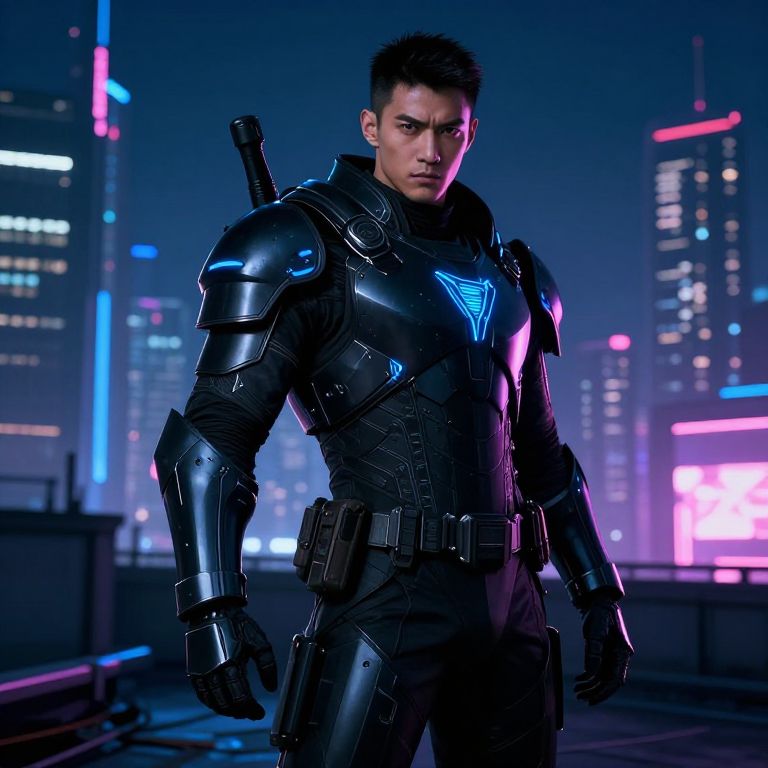 Photorealistic digital artwork of a muscular, young Asian male superhero standing in a futuristic, neon-lit cityscape at night. He wears a sleek, black, form-fitting armored suit with glowing blue triangular designs on the chest and shoulders. The suit has metallic, segmented armor plates on the arms and shoulders, and a sheathed sword is strapped to his back. His short, black hair is neatly styled, and his expression is serious and focused. The background features tall skyscrapers with colorful neon lights in blue, pink, and purple, creating a vibrant, cyberpunk atmosphere. The image has a high contrast, with deep blacks and bright neon highlights.