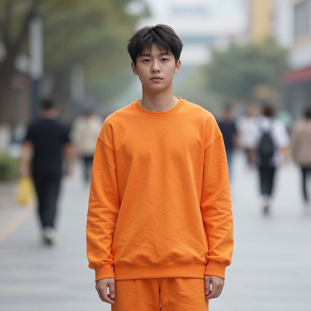 Photograph of a young Asian man with short, black, slightly messy hair, standing on a city street. He wears a bright orange, loose-fitting sweatshirt and matching orange sweatpants. His expression is neutral, with a slight furrow in his brow. The background is blurred, showing a wet street with a few people walking, trees, and buildings. The overcast sky adds a grayish hue to the scene, contrasting with his vibrant outfit. The man is centered in the frame, and the overall style is modern and minimalist.