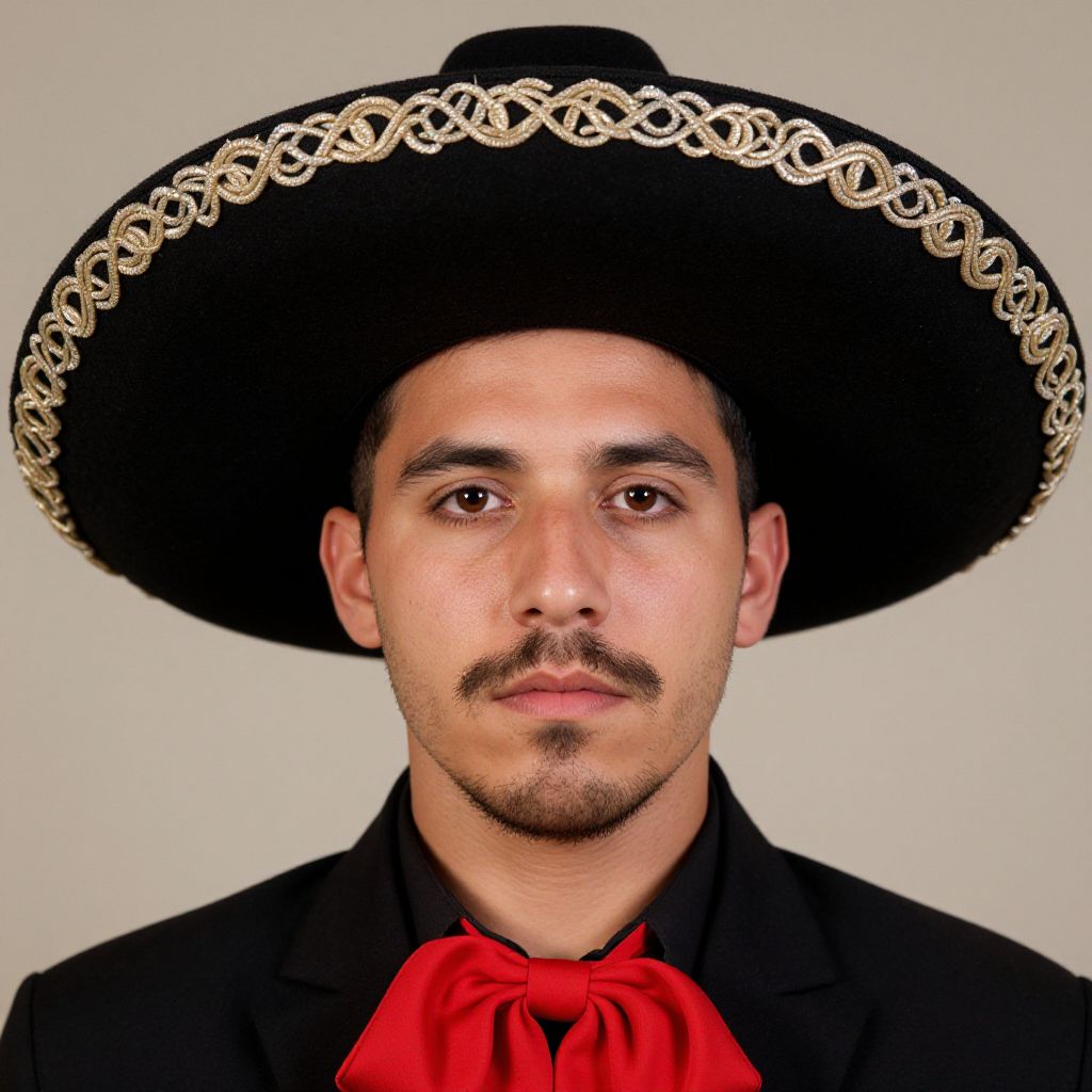 "man mexican costume fancy, 1boy, male focus, solo, black hair, hat, looking at viewer, facial hair, realistic, upper body, closed mouth, brown eyes, mustache Realistic photo of casual sexy person with pretty face"