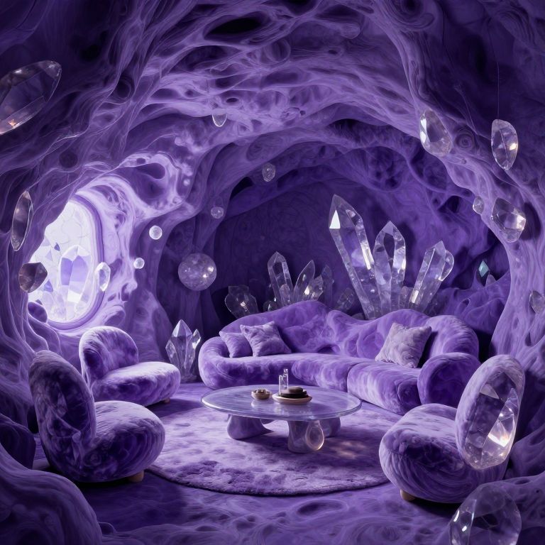 This digital artwork depicts a surreal, cave-like room bathed in purple and violet hues. The textured, cloud-like ceiling and walls create an ethereal, otherworldly atmosphere. Floating crystals and transparent bubbles surround the room. Plush, purple, cloud-shaped sofas and a matching rug form a cozy seating area, centered around a low, circular table holding a small tray. Soft, glowing lights illuminate the space from the left, enhancing the dreamlike quality. The overall style is futuristic and fantastical, blending elements of fantasy and modern design.