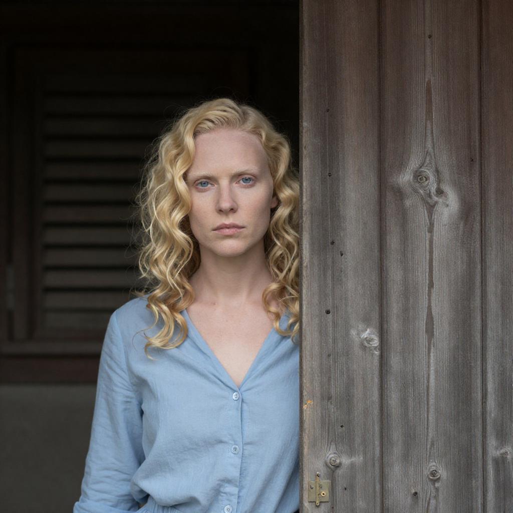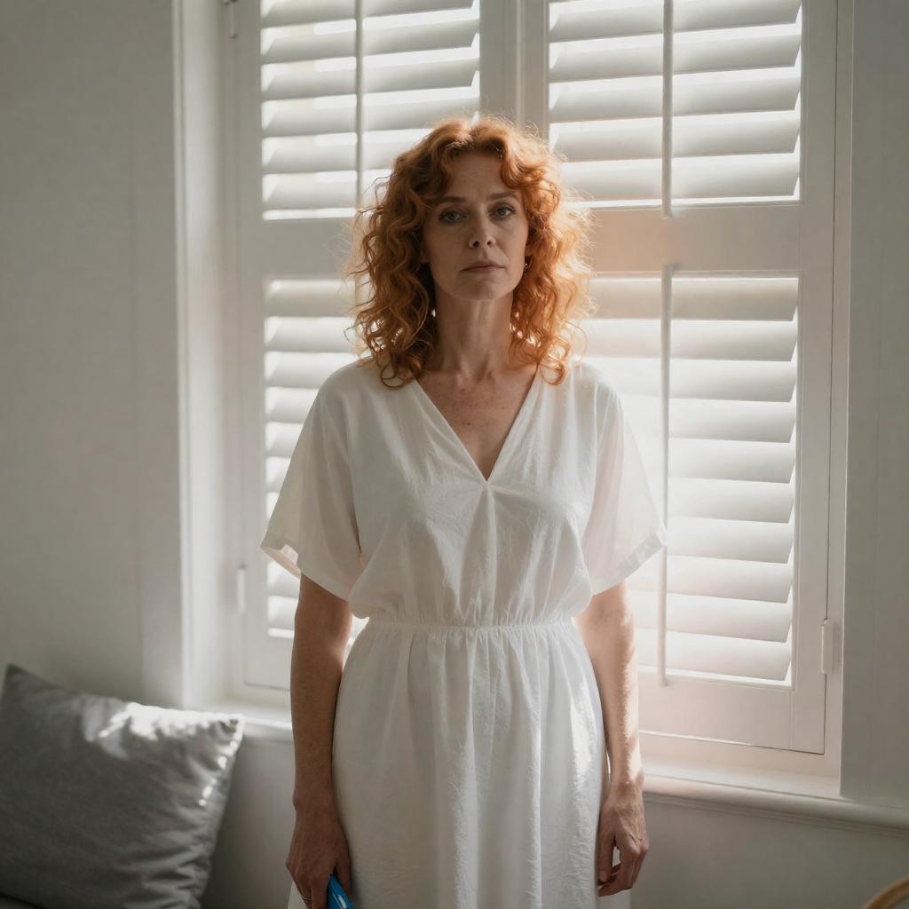 Photograph of a middle-aged woman with curly red hair, wearing a white, loose-fitting dress, holding a blue object in her right hand. She stands in front of white shuttered windows, with sunlight streaming through. Her expression is neutral. A gray pillow is on the left. Two people are not visible.