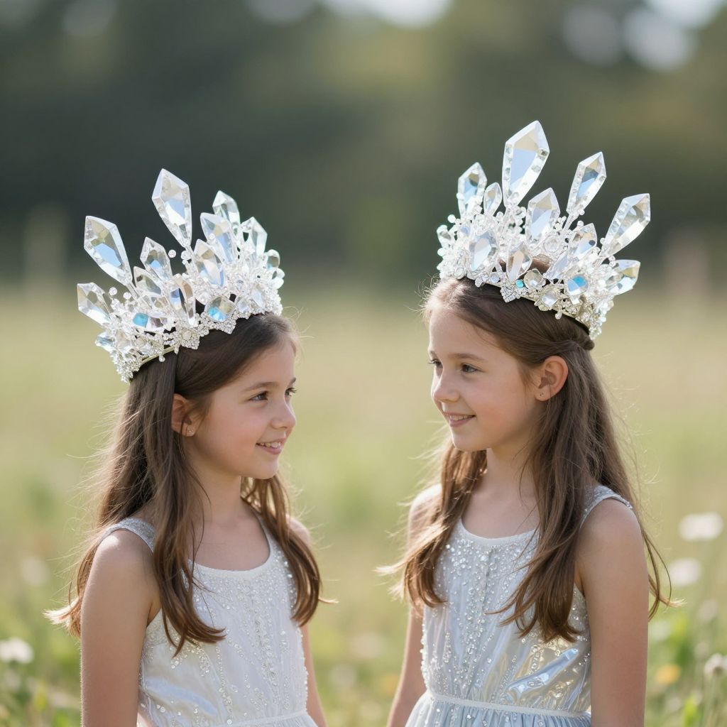 Two children adorned with crystal-like headpieces stand side by side in a serene valley, their unique adornments resembling natural extensions of their being, evoking a fantastical and otherworldly atmosphere through a blend of digital artistry and photorealistic detail.