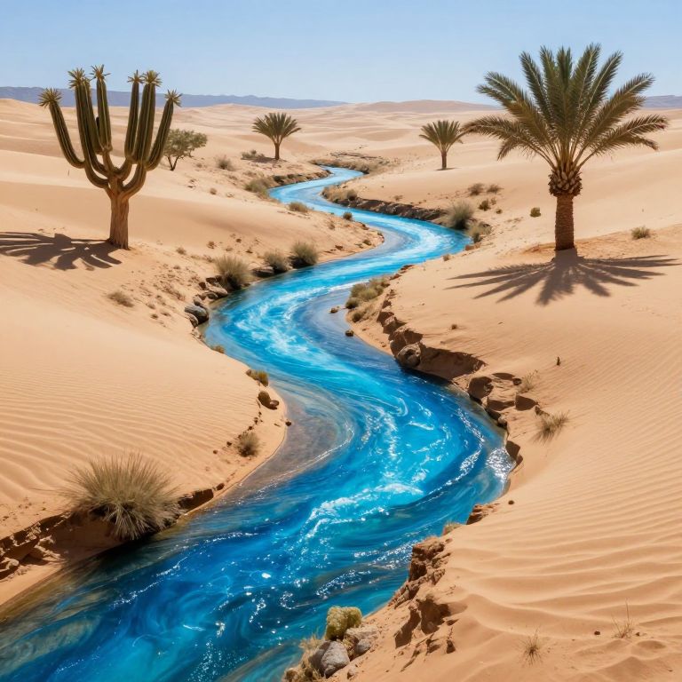 Photograph of a desert landscape featuring a winding, bright blue river flowing through golden sand dunes. The river reflects sunlight, creating a shimmering effect. On either side of the river are sparse, tall, green palm trees and a cactus with multiple arms. The sand has subtle ripples, and small tufts of grass are scattered around. The sky is clear and blue, contrasting with the warm tones of the sand and the vivid blue of the water. The overall scene is arid yet vibrant, highlighting the contrast between the desert and the flowing river.