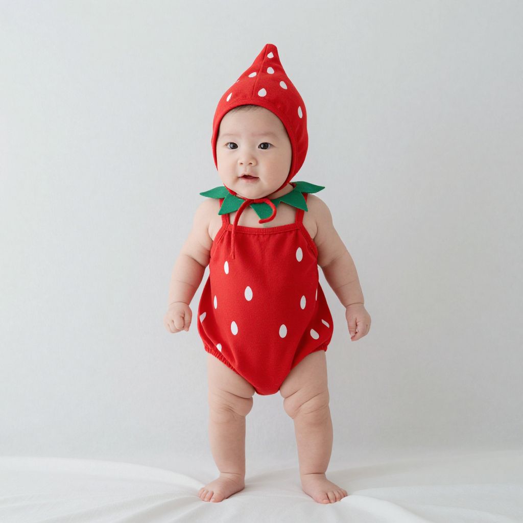 Newborn Strawberry Costume, baby in a strawberry costume standing in front of a white backdrop