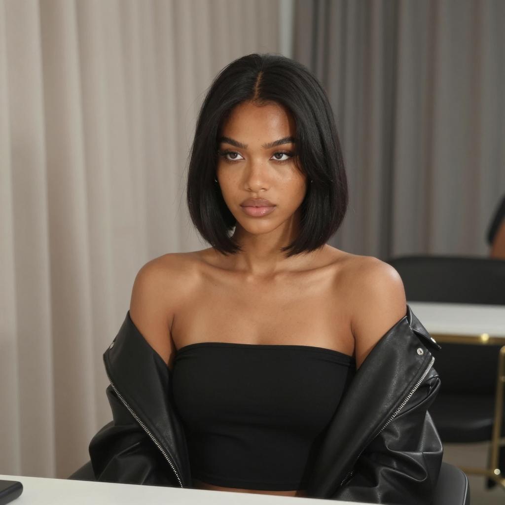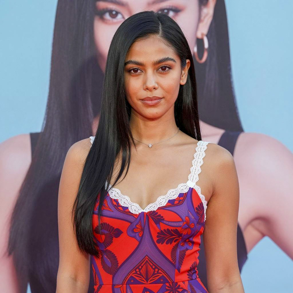 Photograph of a young woman with long, wavy brown hair, light tan skin, and brown eyes. She wears a black top with a deep neckline and a small heart necklace. She has a neutral expression and is positioned in the center. The background is blurred with colorful bokeh lights. She is seated with a microphone in front of her. One person.