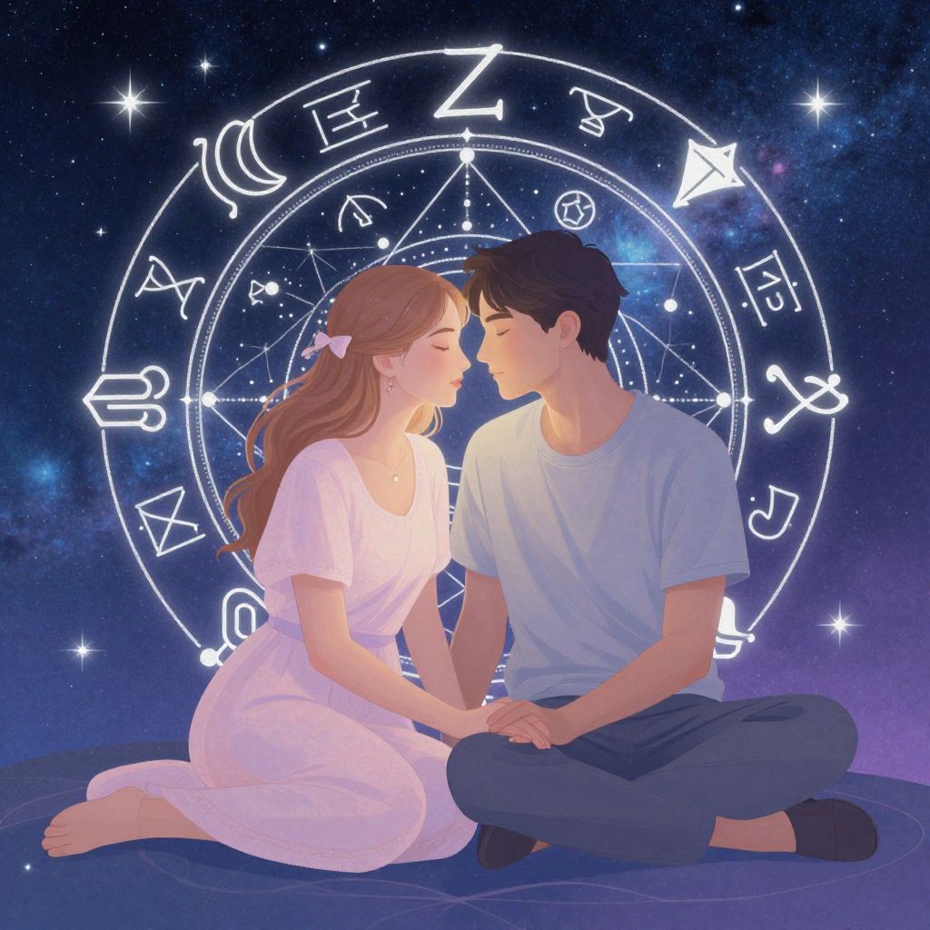 Digital illustration of a couple seated cross-legged, gazing into each other's eyes against a starry, zodiac-themed background. Both wear white and
